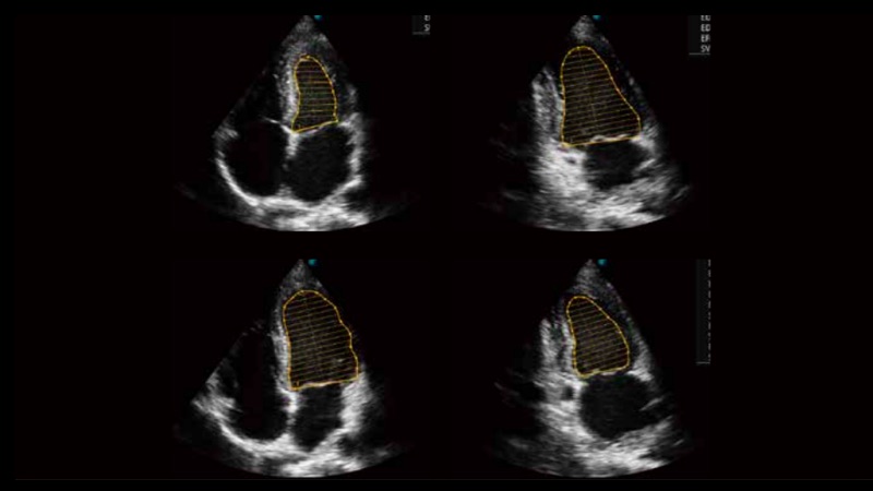 自動識別收縮和舒張末期心肌內膜,自動計算射血分數EF值。