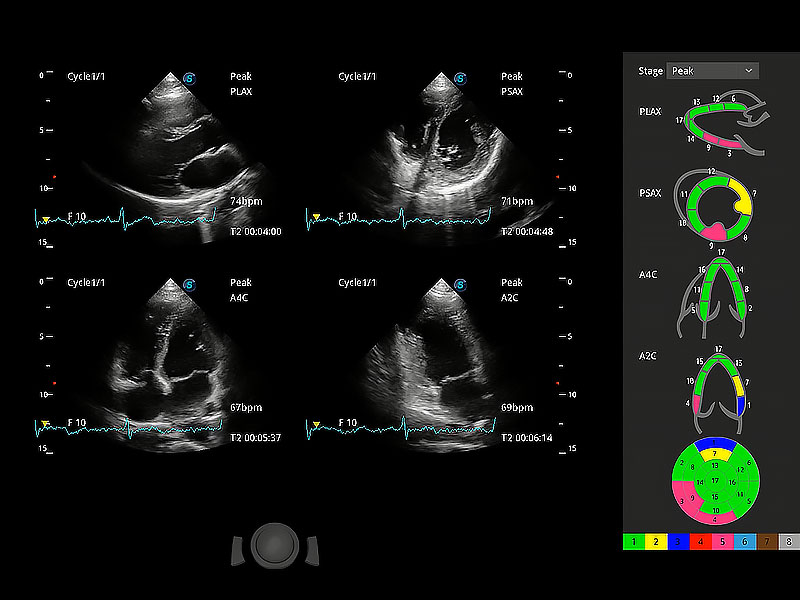 實(shí)時用顏色表示心肌組織運(yùn)動,觀察和定量組織的運(yùn)動情況,對快速檢測與評估心肌的灌注和活性、電傳導(dǎo)及心肌收縮和舒張功能等均能提供重要的診斷信息。