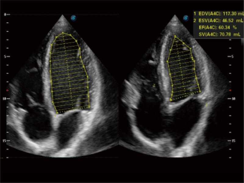 能夠基于左心室壁追蹤和辛普森法,自動計算射血分?jǐn)?shù),支持多個可移動點(diǎn)描跡,與手動測量相比,極大節(jié)省了動物醫(yī)生的時間和精力。