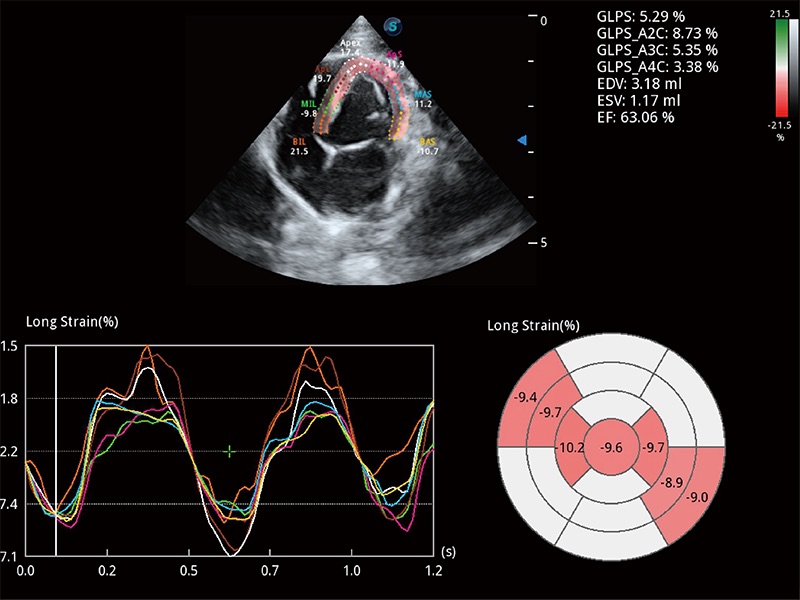 通過心肌識別技術(shù)與二維斑點(diǎn)追蹤技術(shù)相結(jié)合,對心臟的超聲圖像進(jìn)行量化分析。計算心肌17個節(jié)段的應(yīng)變、應(yīng)變率、速度、位移等,并通過牛眼圖的形式進(jìn)行呈現(xiàn)。