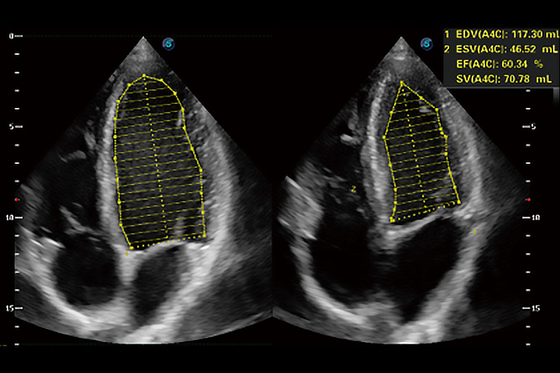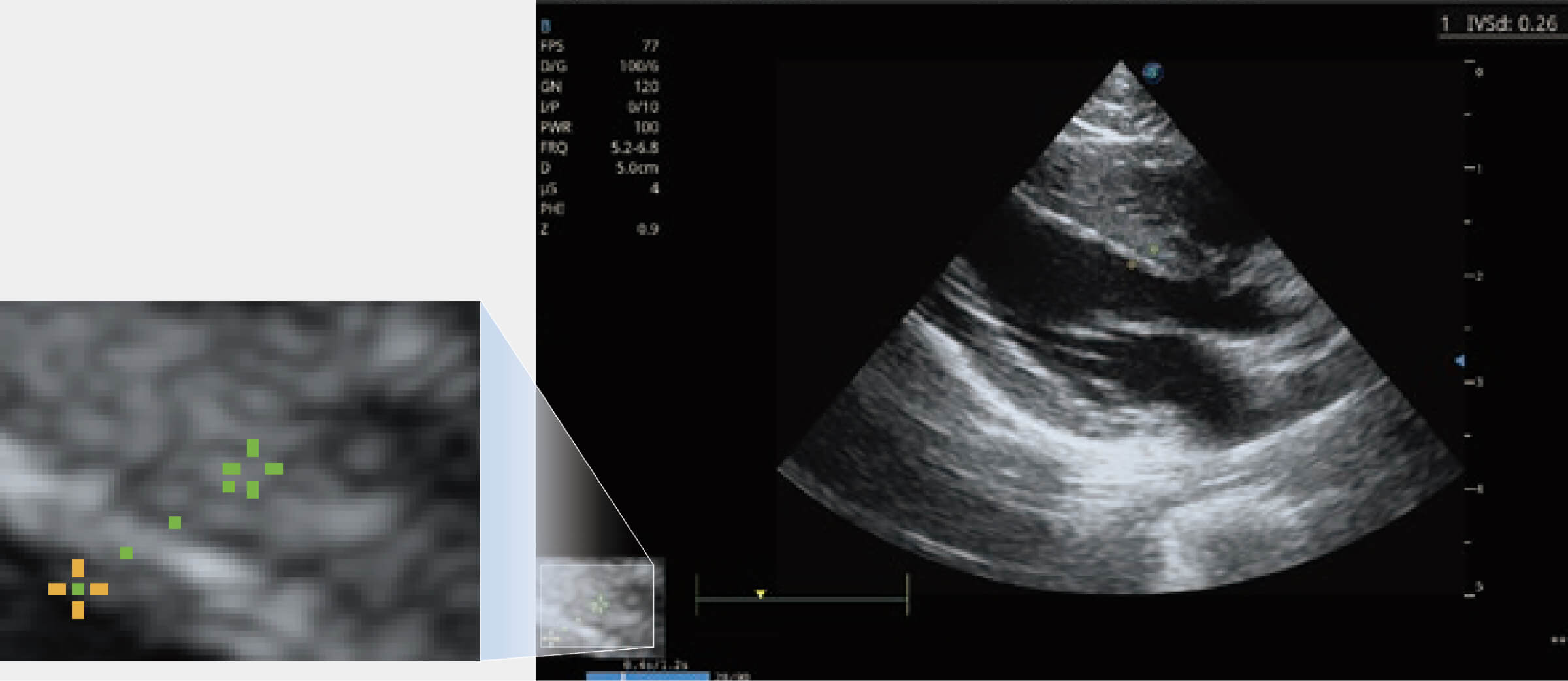 能夠基于左心室壁追蹤和辛普森法,自動計(jì)算射血分?jǐn)?shù),支持多個可移動點(diǎn)描跡,與手動測量相比,極大節(jié)省了動物醫(yī)生的時(shí)間和精力。