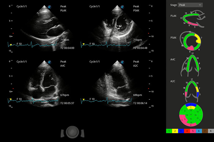 實(shí)時(shí)用顏色表示心肌組織運(yùn)動,觀察和定量組織的運(yùn)動情況,對快速檢測與評估心肌的灌注和活性、電傳導(dǎo)及心肌收縮和舒張功能等均能提供重要的診斷信息。